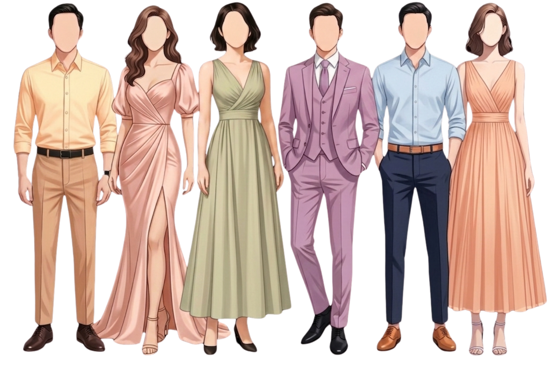 PASTEL HUES ARE WARMLY ENCOURAGED: PALE SAGE, LIGHT PURPLE, BLUSH PINK, POWDER BLUE, PEACH