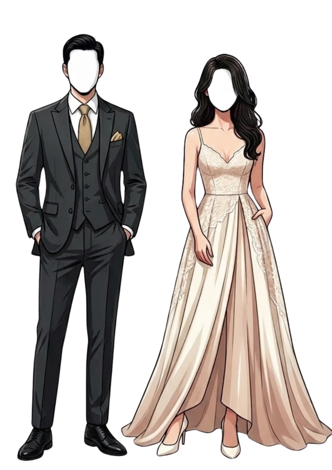 We kindly request our guests to grace the occasion in floor-length or midi gowns in muted gold, champagne, ivory, or blush, crafted from luxurious fabrics such as silk, satin, chiffon, or lace. Gentlemen are invited to wear dark suits or tuxedos paired with crisp white shirts and a muted gold tie or coordinating pocket square, for a timeless and sophisticated ensemble.