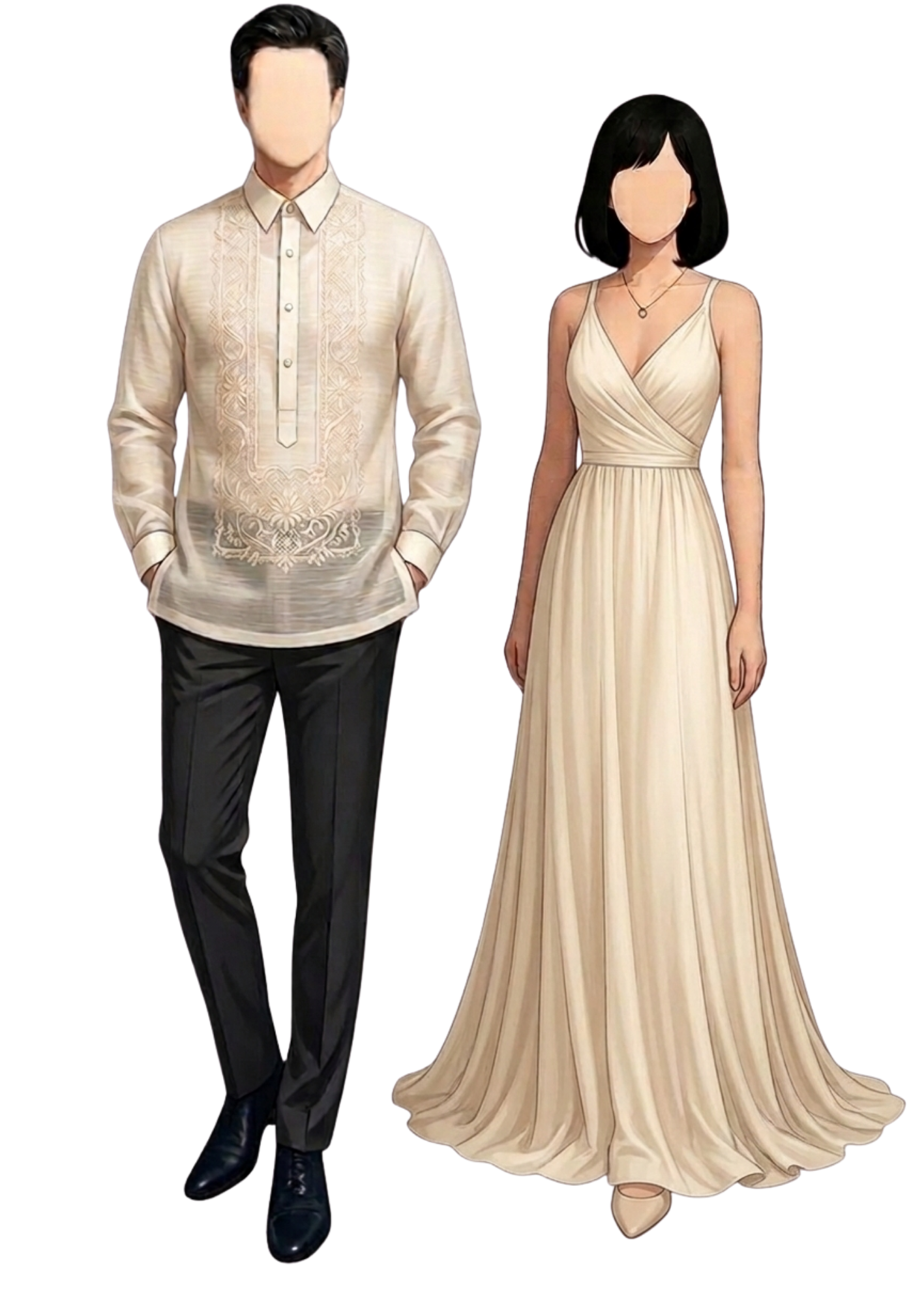 Gentlemen: Traditional Barong with Black Pants Ladies: Dress/jumpsuit in any shade of Beige, Taupe, Cream, and sage green.