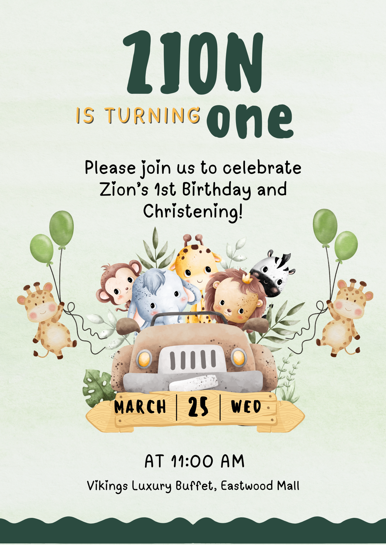 It is with hearts full of joy and spirits as bright as the Savannah that we welcome you to Zion’s Safari Adventure. Today is a truly "roaring" milestone as we celebrate both his Holy Christening and his 1st Birthday!